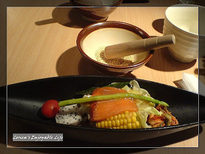 燻鮭魚加上一些蔬菜 配上日式和風醬汁