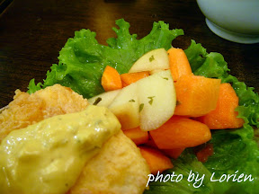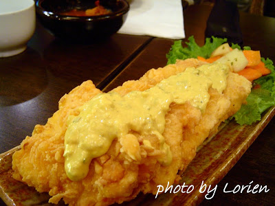 這到魚排是把鱈魚裹粉炸過 再淋上微酸的起士醬